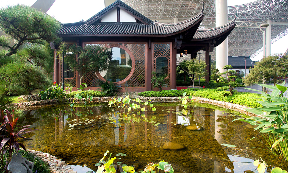 G20峰會主會場空中花園施工內容包括屋頂花園景觀、仿古建筑、水體景觀積水循環系統等。屋頂花園整體以“西湖明珠從天降、龍飛鳳舞到錢塘”為設計理念,以典型的江南園林風格為范本,吸收了中國古典園林中多種造景元素,詩意地闡釋了江南園林的獨特韻味。水景、植栽、石景和建筑相互輝映,傳統江南園林的工匠精神與哲學思考深蘊其中,展現細致入微且非常玄妙的獨特美感。是國內功能齊全,中國特色濃郁,生態環境優美的屋頂花園。